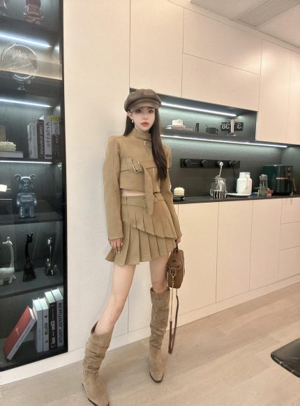 Oblique Zipper Lace-up Cutout Pleated Skirt Suit