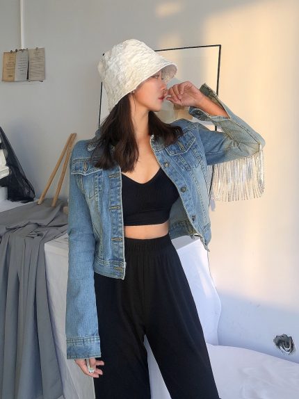 The Rhinestone Embellished Denim Jacket is a stylish and eye-catching outerwear piece that adds a touch of glamour to the