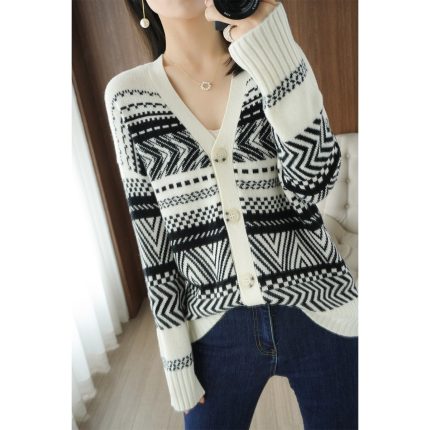 The women’s vintage jacquard wool knit jacket cardigan is a stylish and cozy piece that blends timeless charm with modern