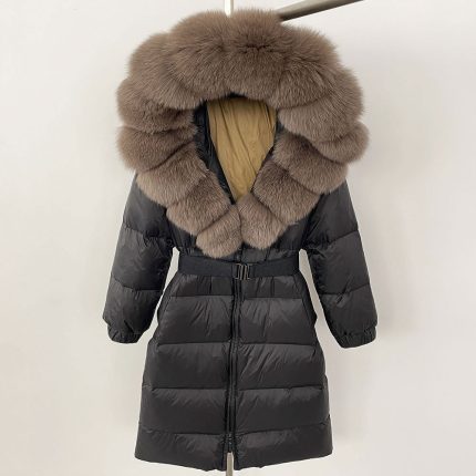The Women’s Long Cinched Hoodie Real Fox Collar Fur Down Jacket Coat is a luxurious and stylish outerwear piece that