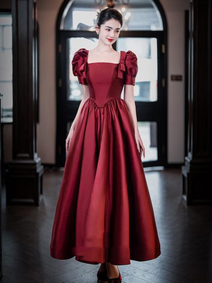 Product information: Pattern: Solid color Style: Elegant Waist type: middle-waisted Popular element: straps Color classification: red Sleeve type: Bubble sleeves