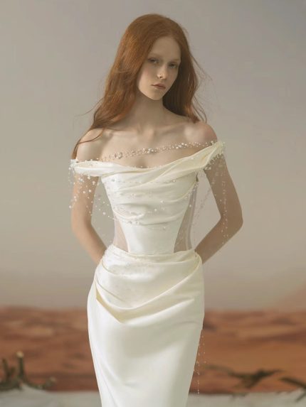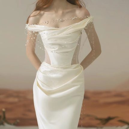 White Simple Outerwear Yarn Satin Off-shoulder Fishtail Dress