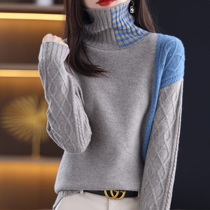 This women’s turtleneck sweater offers a stylish and modern look with its loose fit and eye-catching contrast color design. The