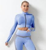 Made from a stretchable, moisture-wicking fabric, this jacket ensures you stay dry and cozy while moving freely. The long sleeves and high collar offer added warmth for chilly autumn or winter workouts, while the sleek, fitted design provides a flattering silhouette. Whether you’re practicing yoga indoors or braving the outdoors for a fitness session, this jacket delivers both performance and style, making it an essential addition to your winter activewear collection.