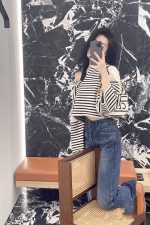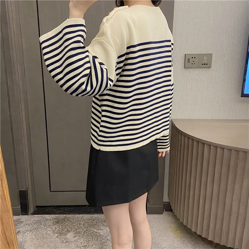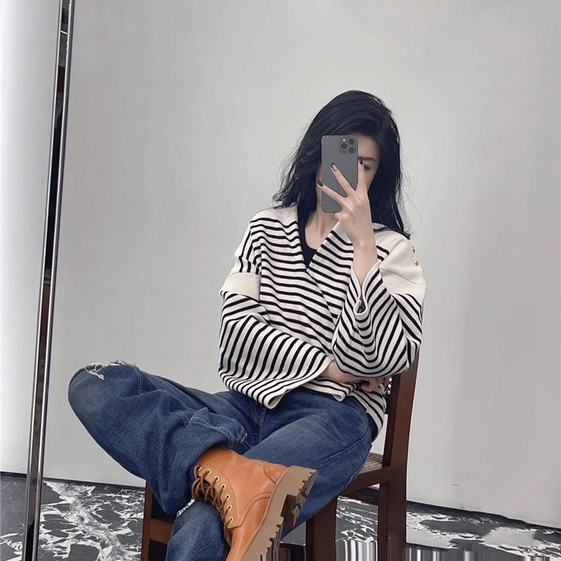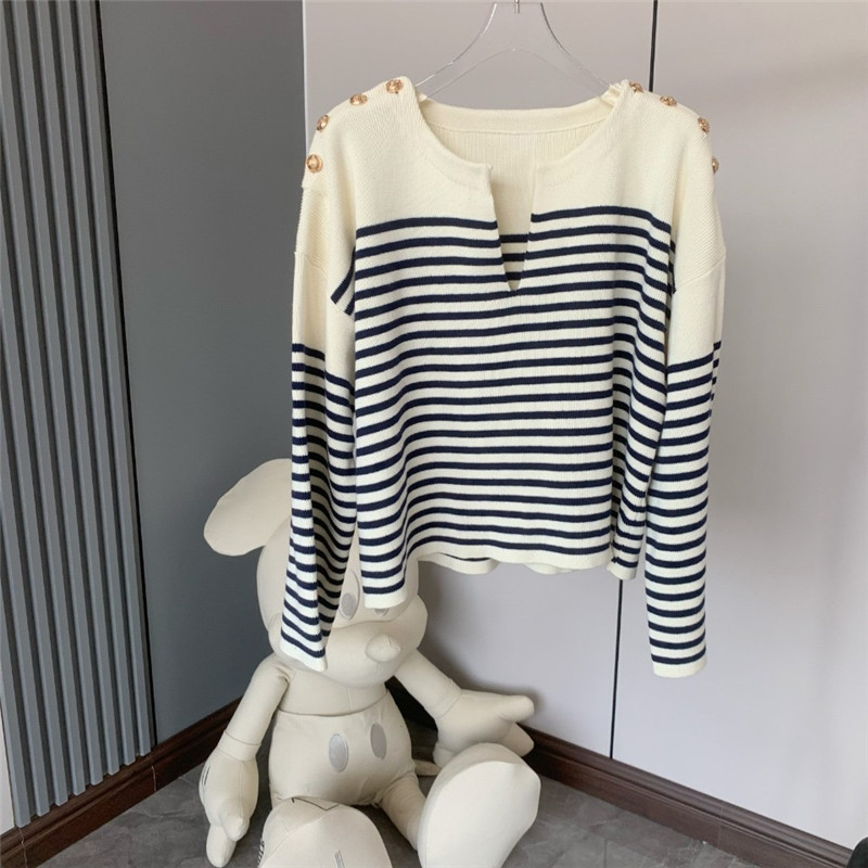 Stay stylish and comfortable with this trendy V-neck sweater. Featuring a flattering V-neckline and chic shoulder button detailing, this knit sweater offers a relaxed, loose fit perfect for everyday wear. The classic stripe pattern adds a touch of timeless style, making it a versatile piece that can be dressed up or down. Crafted from a soft and cozy knit material, this sweater is ideal for layering and will keep you warm and comfortable all day long. A must-have addition to your wardrobe!