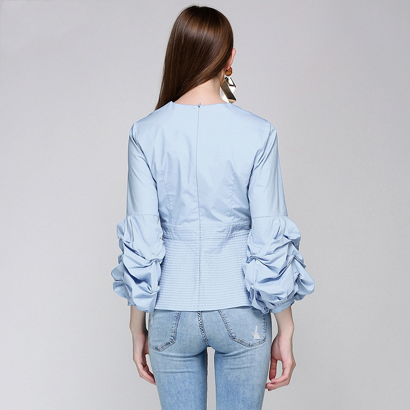 Be the first to review “Slim V-Neck Nine-Point Sleeve Ruffled Blouse” Cancel reply